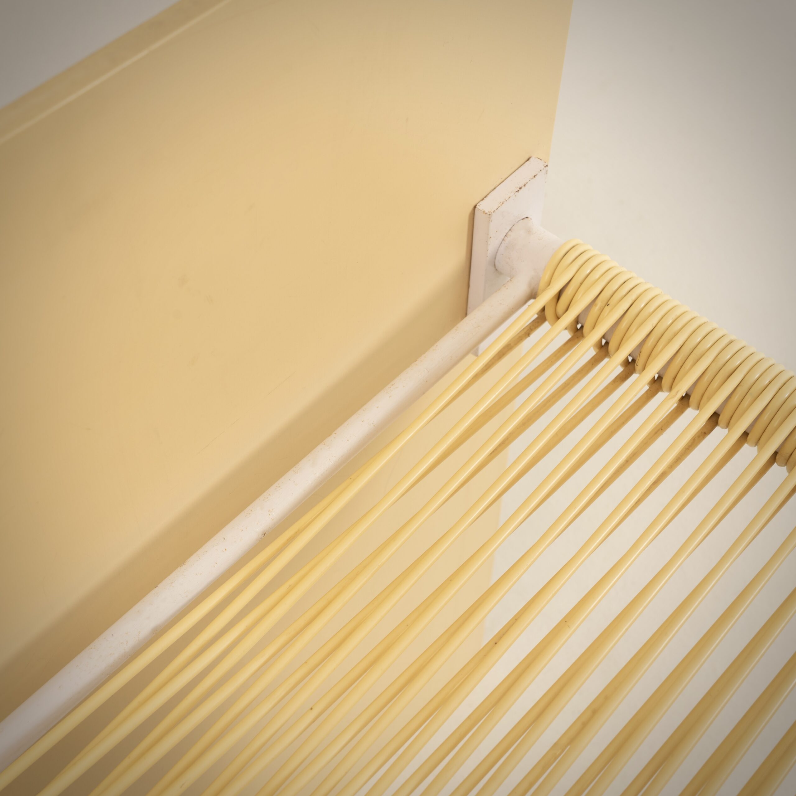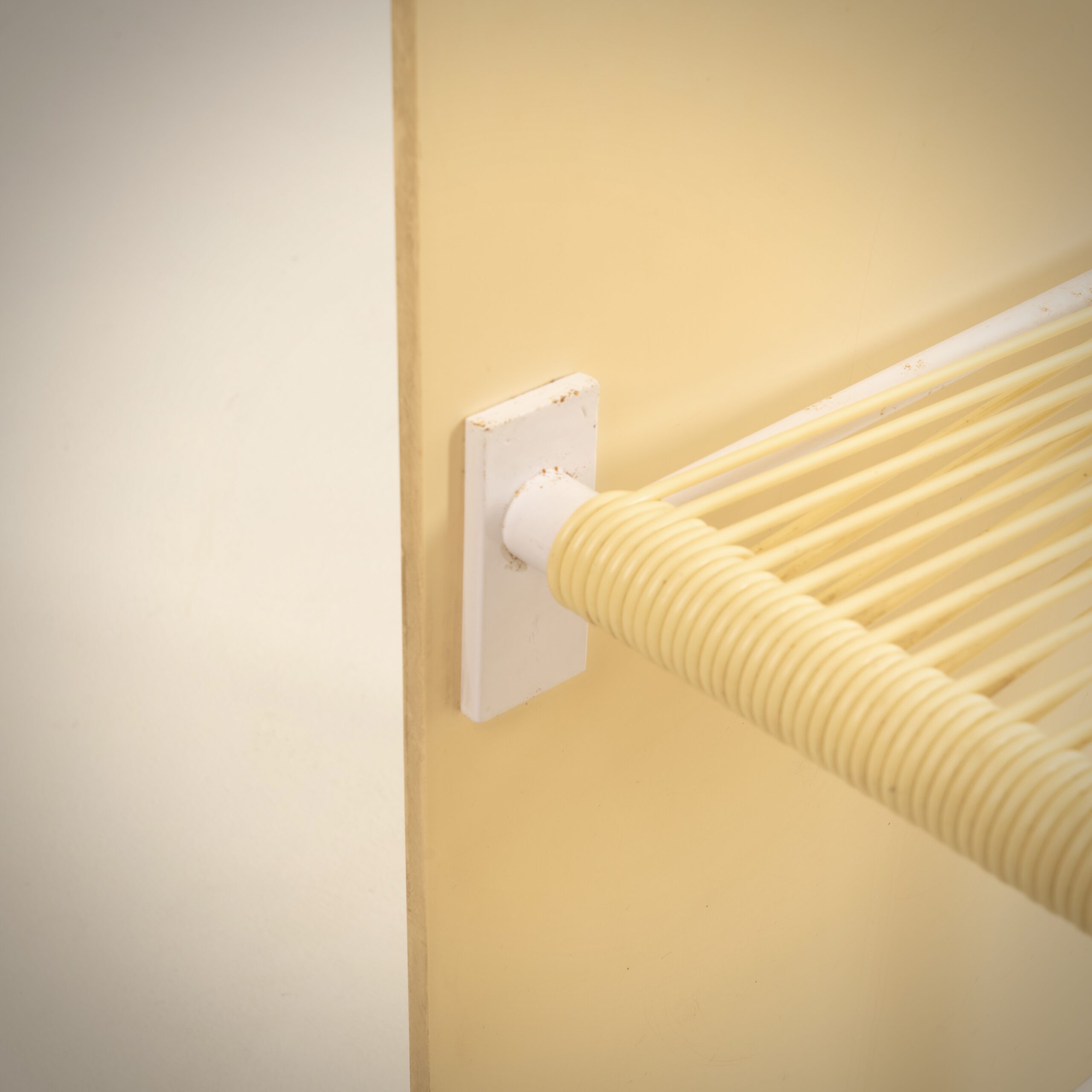 Métal laqué blanc, panneau PVC blanc, isogaine, coussin tissu blanc et rouge
